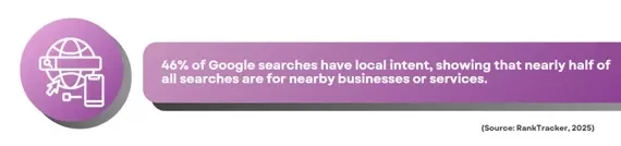 - 46% of Google searches have local intent, showing that nearly half of all searches are for nearby businesses or services
